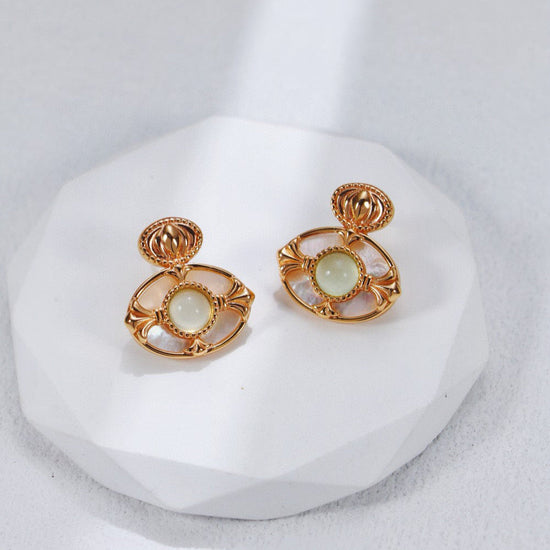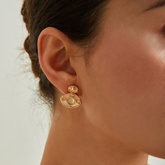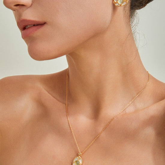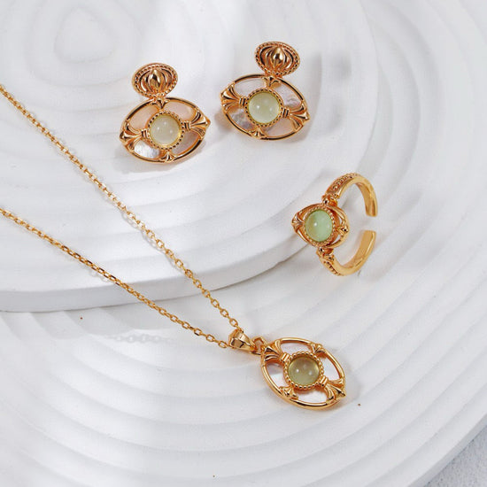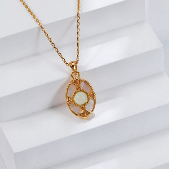 This exquisite necklace combines the natural beauty of grape chalcedony and mother-of-pearl with a vintage gold finish, creating a unique and elegant accessory. Perfect for adding a touch of sophistication to any outfit, it’s ideal for both casual and formal occasions.