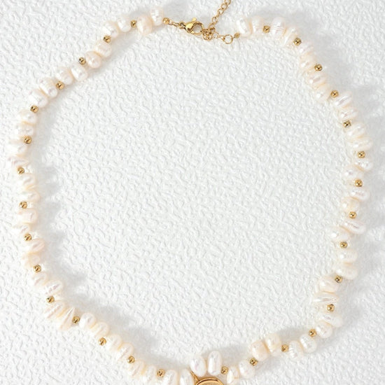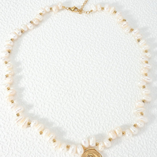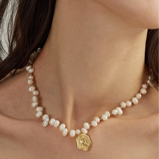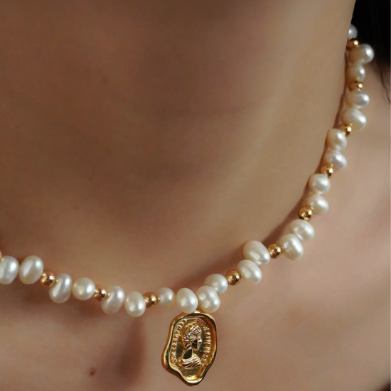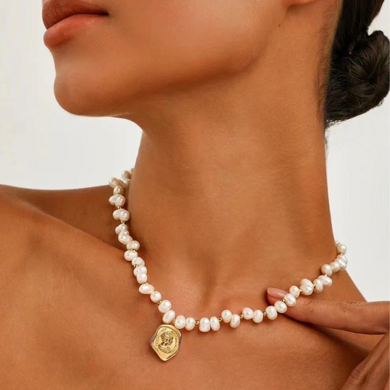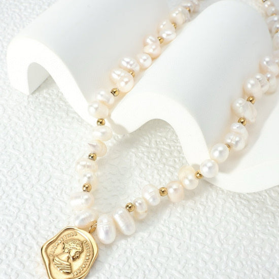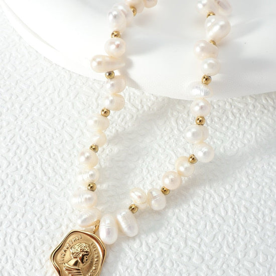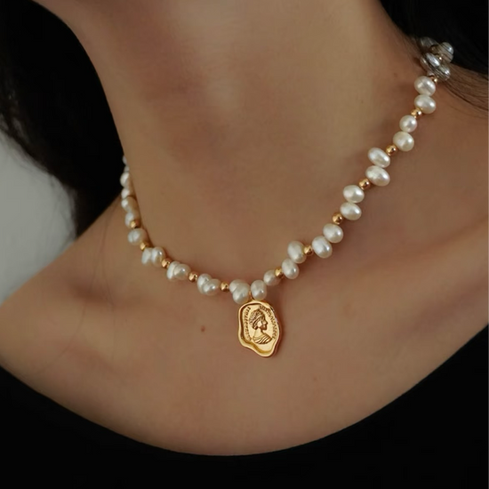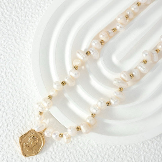 The Arona Fortress Seal of Wax Queen's Portrait Necklace features a French vintage style with natural baroque pearls and high-quality brass with uneven 18K gold plating. The pearls stack gracefully on the collarbone, adding a gentle, elegant touch to any outfit.