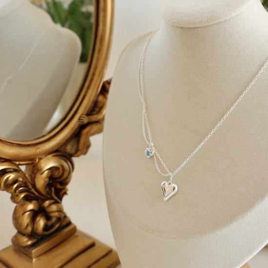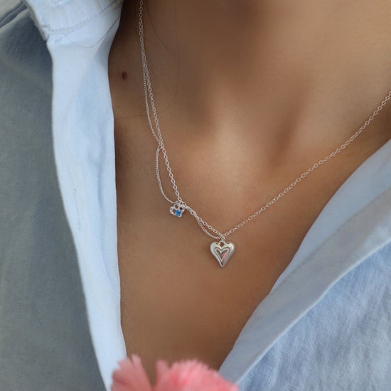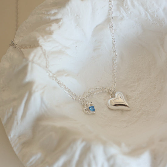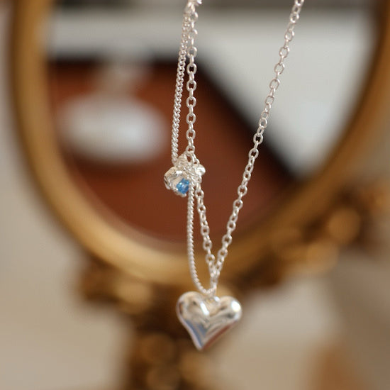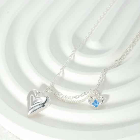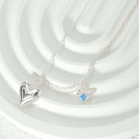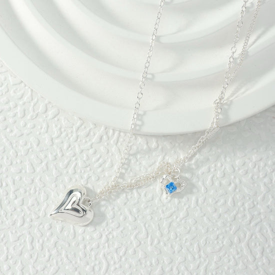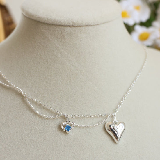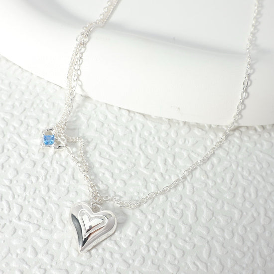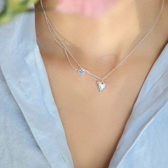 This Layered Heart Necklace is an original design made from solid sterling silver with blue zircon stones. It features a unique double pendant and a layered style, perfect for enhancing your collarbone.