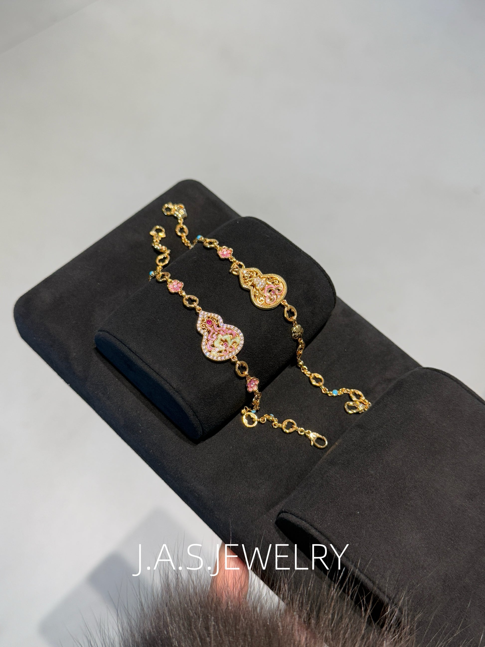 The softly rounded silhouette represents wholeness and prosperity, while delicate enamel florals and high-density pavé stones catch the light with a restrained, elegant glow.