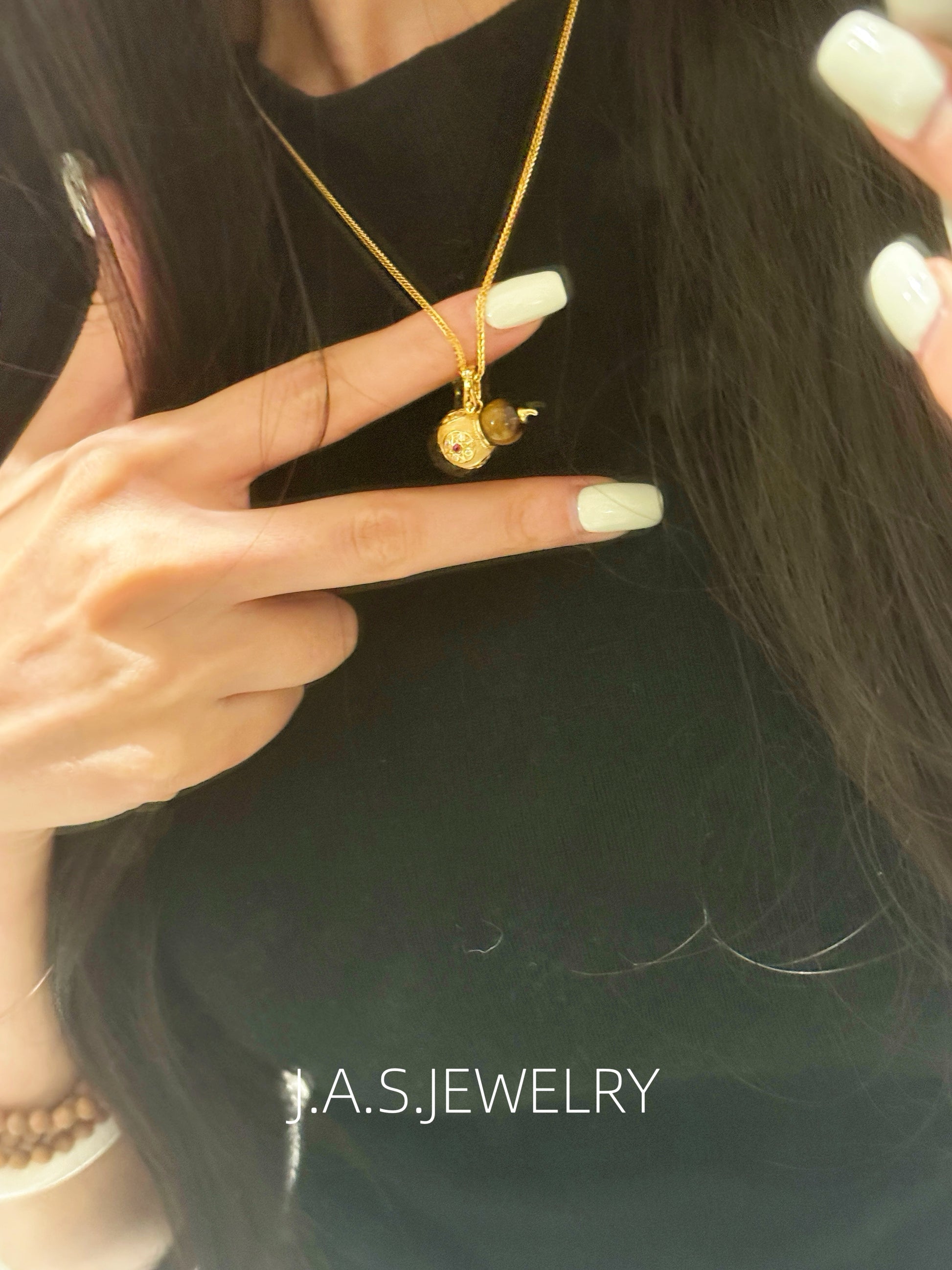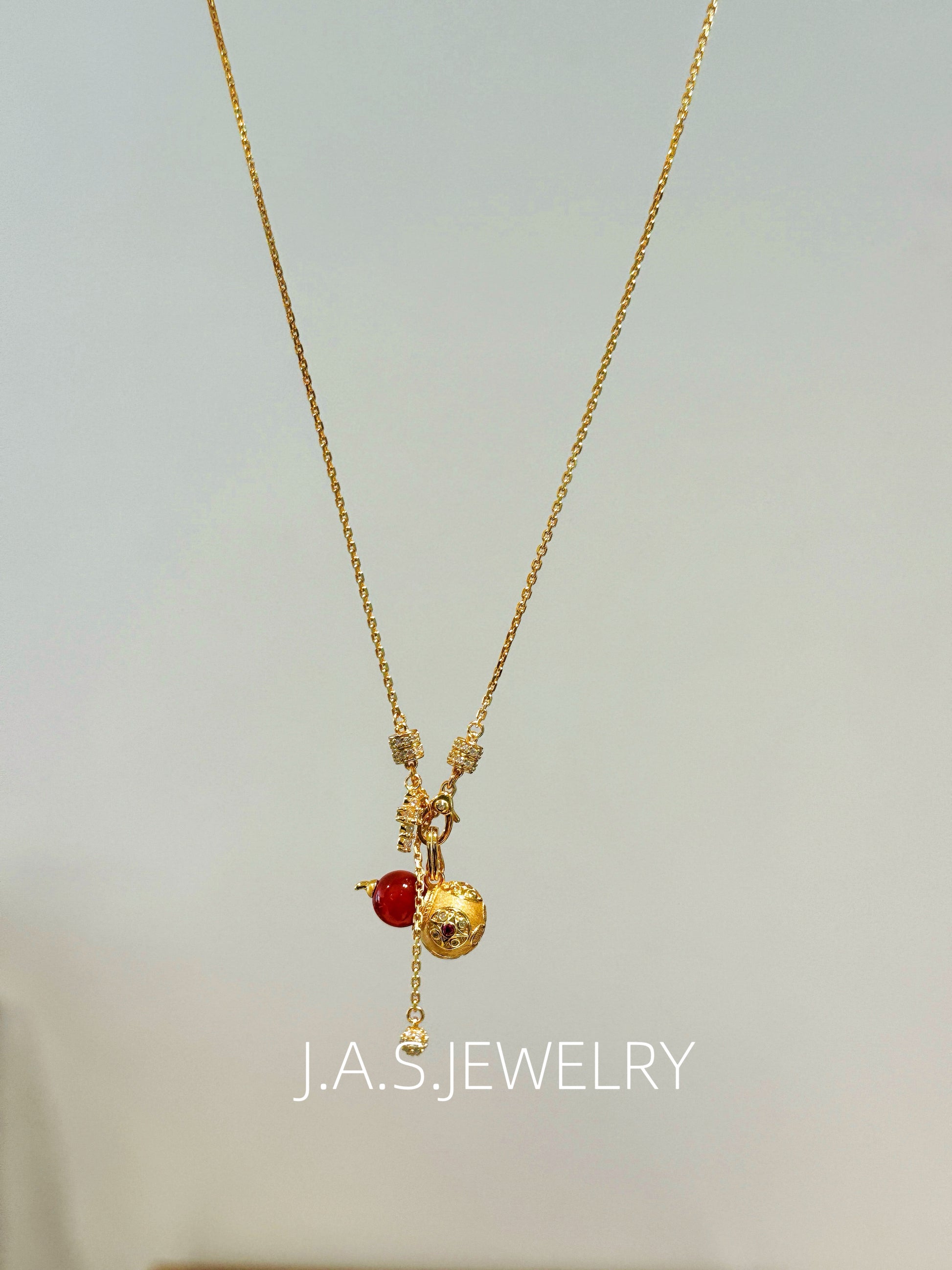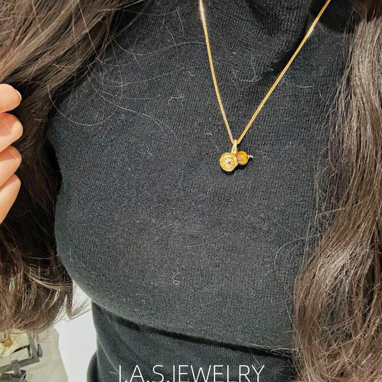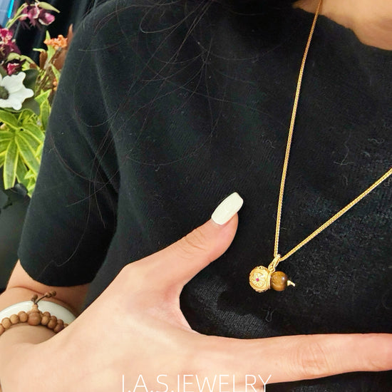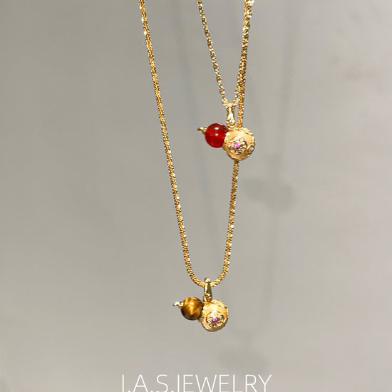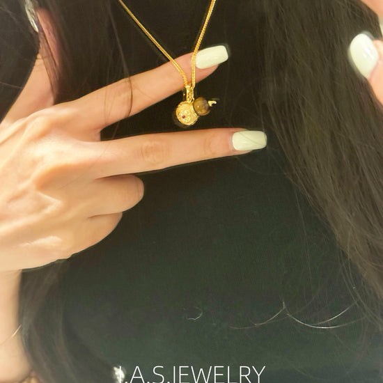 A smooth gemstone bead is paired with an intricately detailed gold-toned gourd charm, creating a balanced and elegant silhouette.