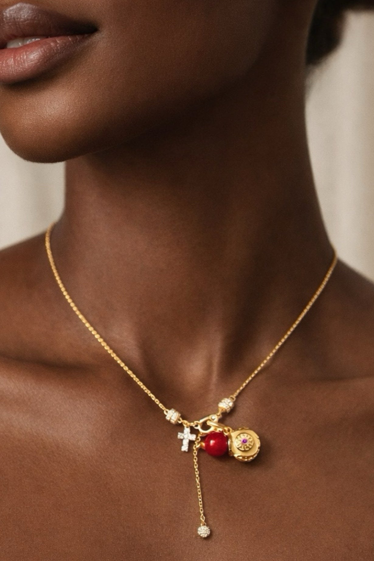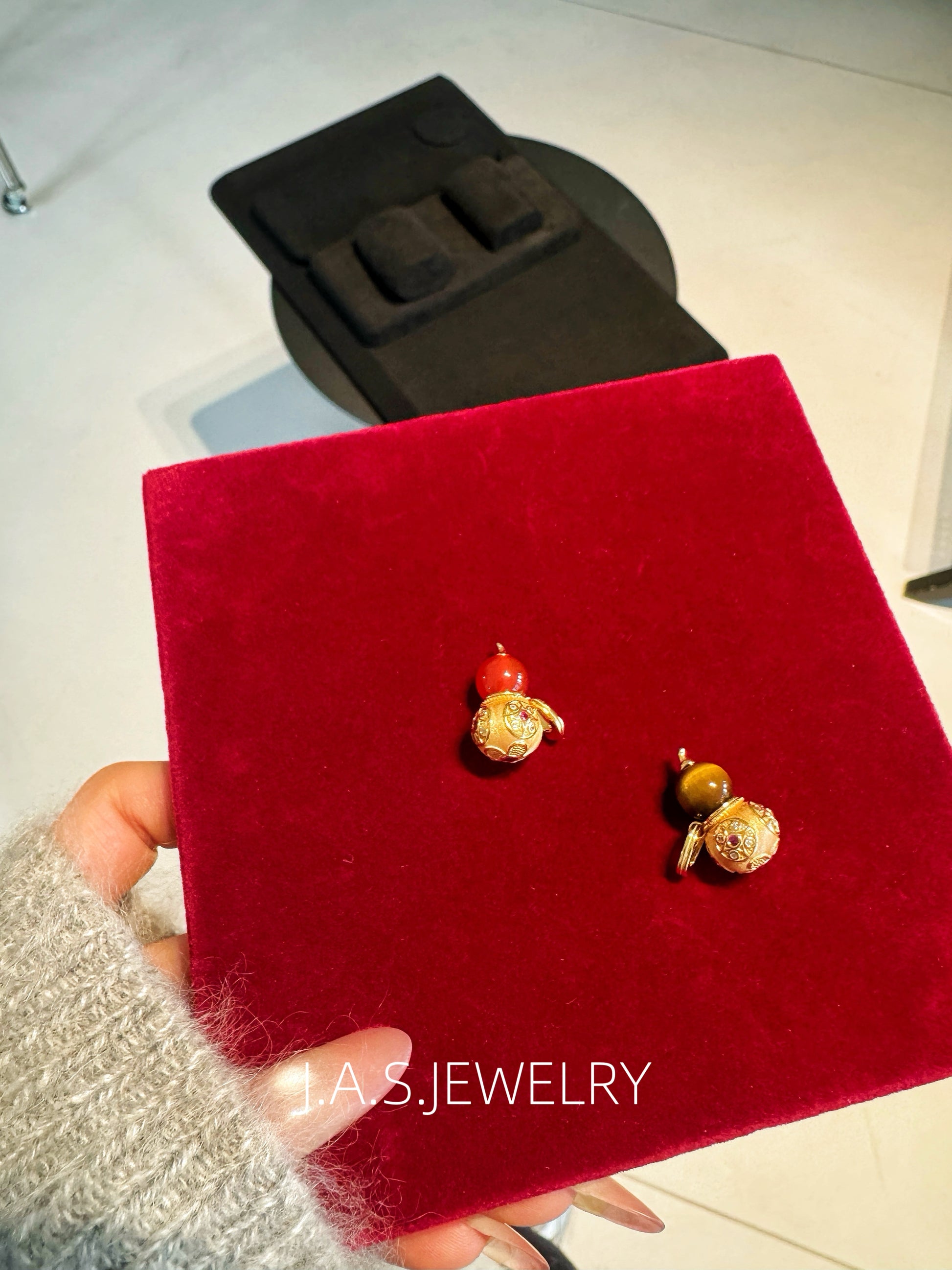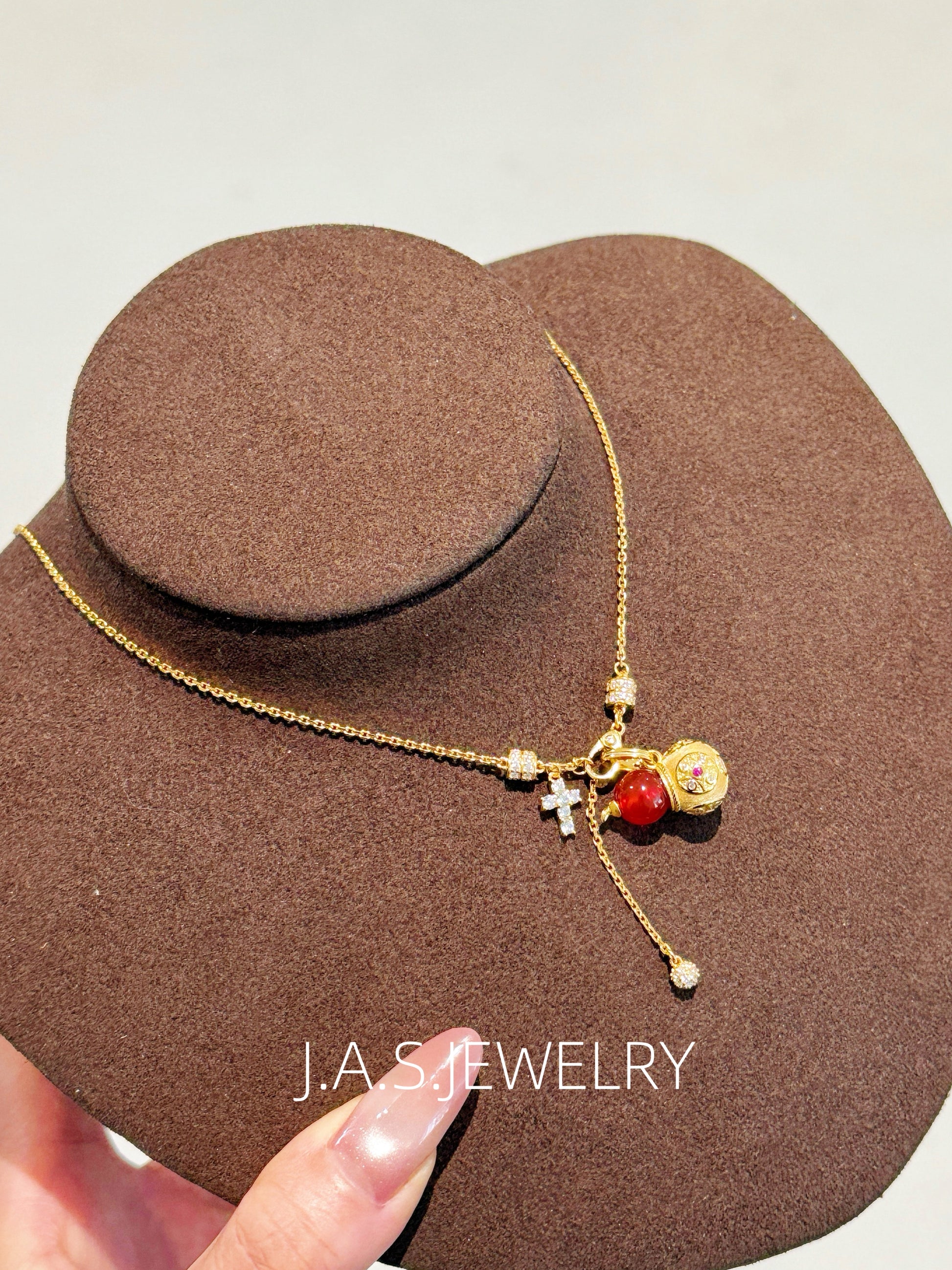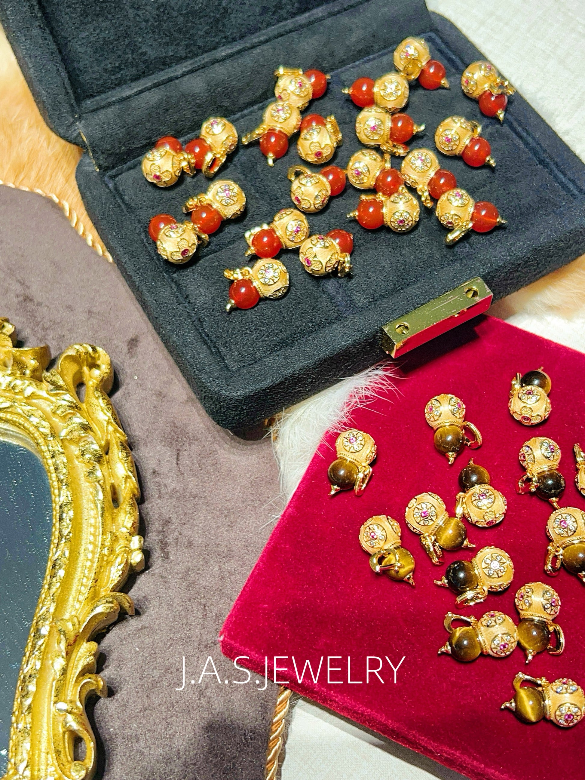 A smooth gemstone bead is paired with an intricately detailed gold-toned gourd charm, creating a balanced and elegant silhouette.