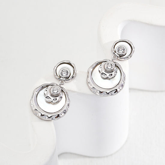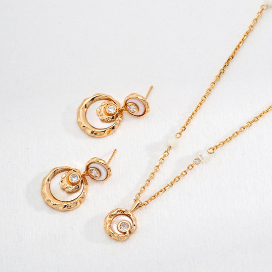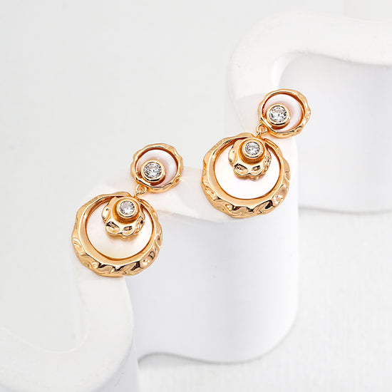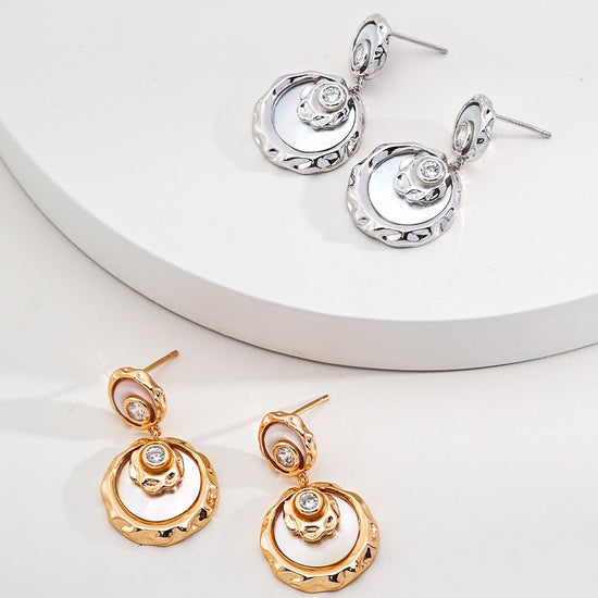 This earrings are made from 925 sterling silver with a thick 18K gold coating (2.5-3.0 microns), natural mother-of-pearl, and zirconia, offering durability, shine, and a unique touch to each piece.