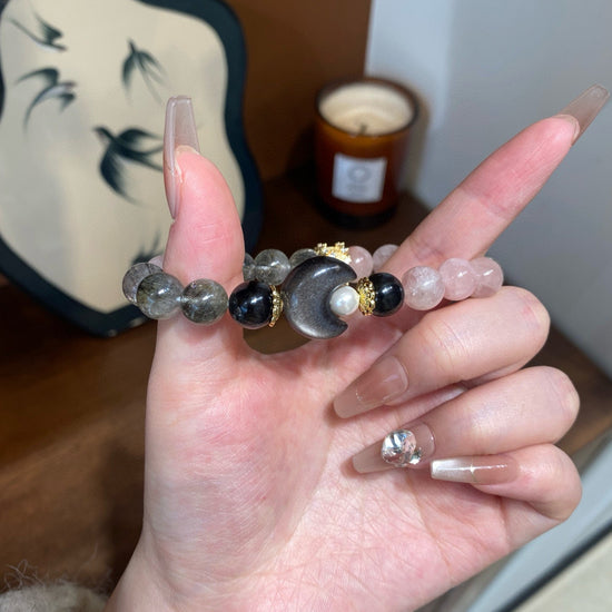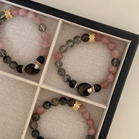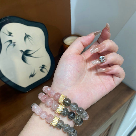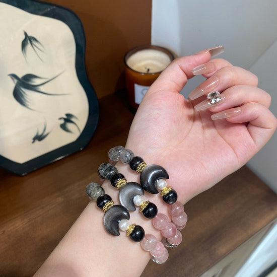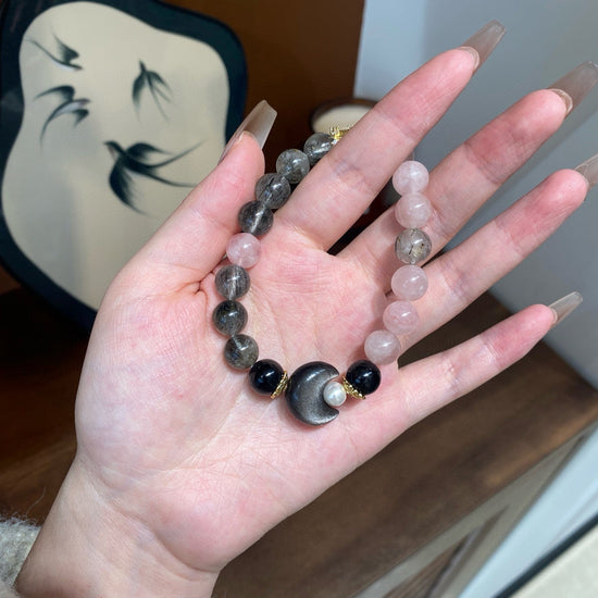 This bracelet features rose quartz, gray rabbit quartz, and silver sheen obsidian as its main materials. The beads are approximately 8mm in size, with an adjustable elastic design suitable for wrist circumferences up to 17cm. Each bead is carefully selected, not only for its beauty but also for its rich energetic and healing properties.