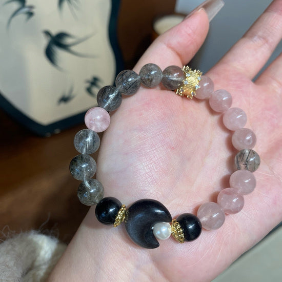 Jade Rabbit - Rose Quartz, Gray Rabbit Quartz, and Silver Sheen Obsidian Crystal Bracelet