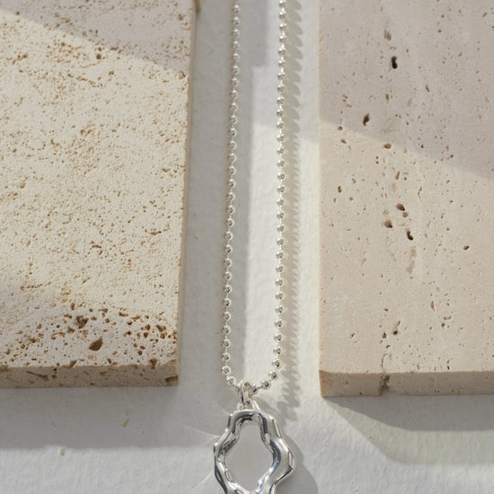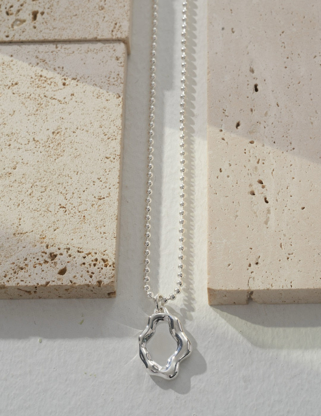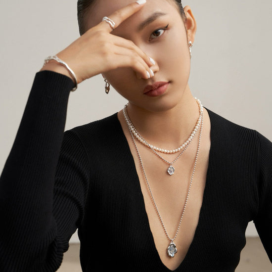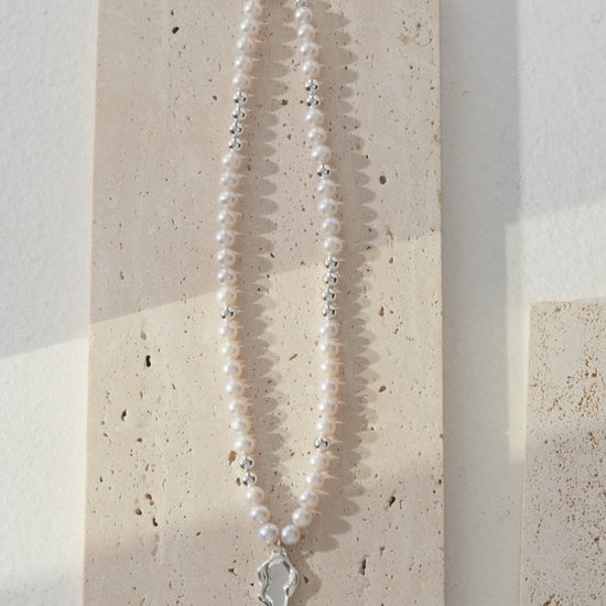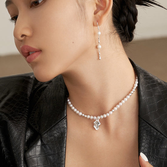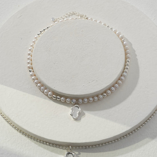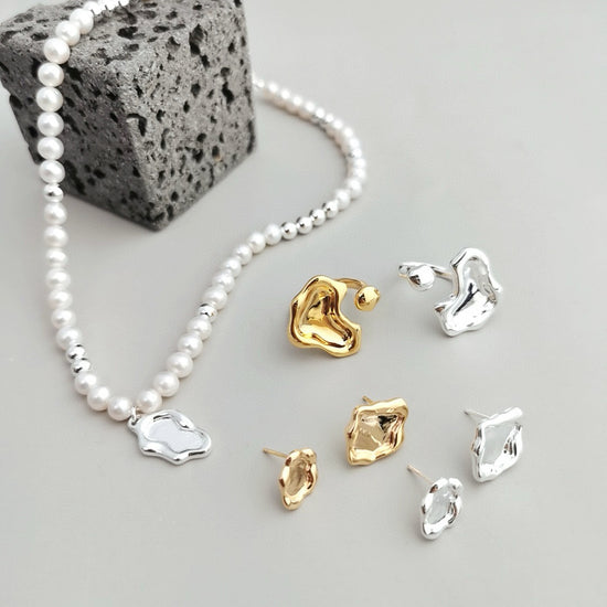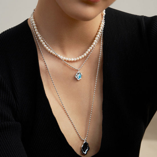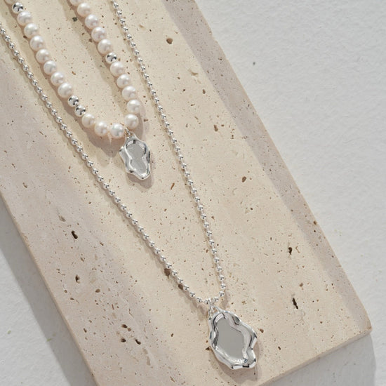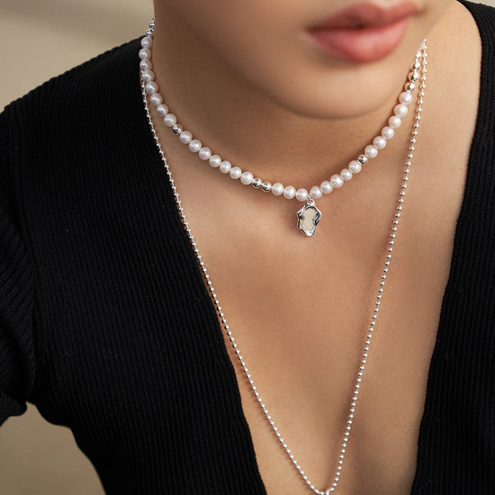 The Mirror Lake Series Silver Pearl Necklace is inspired by the peaceful beauty of mountain lakes. Featuring undulating edges like mountain shapes, concave surfaces reflecting calm water, and layered dimensions, this design creates a striking visual contrast.