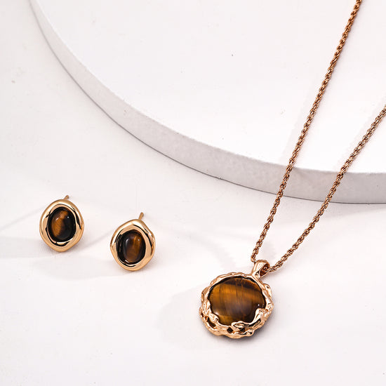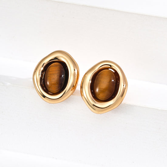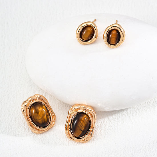 These vintage-inspired earrings feature natural tiger eye stones, known for their rich colors and captivating patterns. The earrings’ design exudes earthy elegance and timeless appeal, making them a perfect accessory to add a touch of sophistication and boldness to any look.