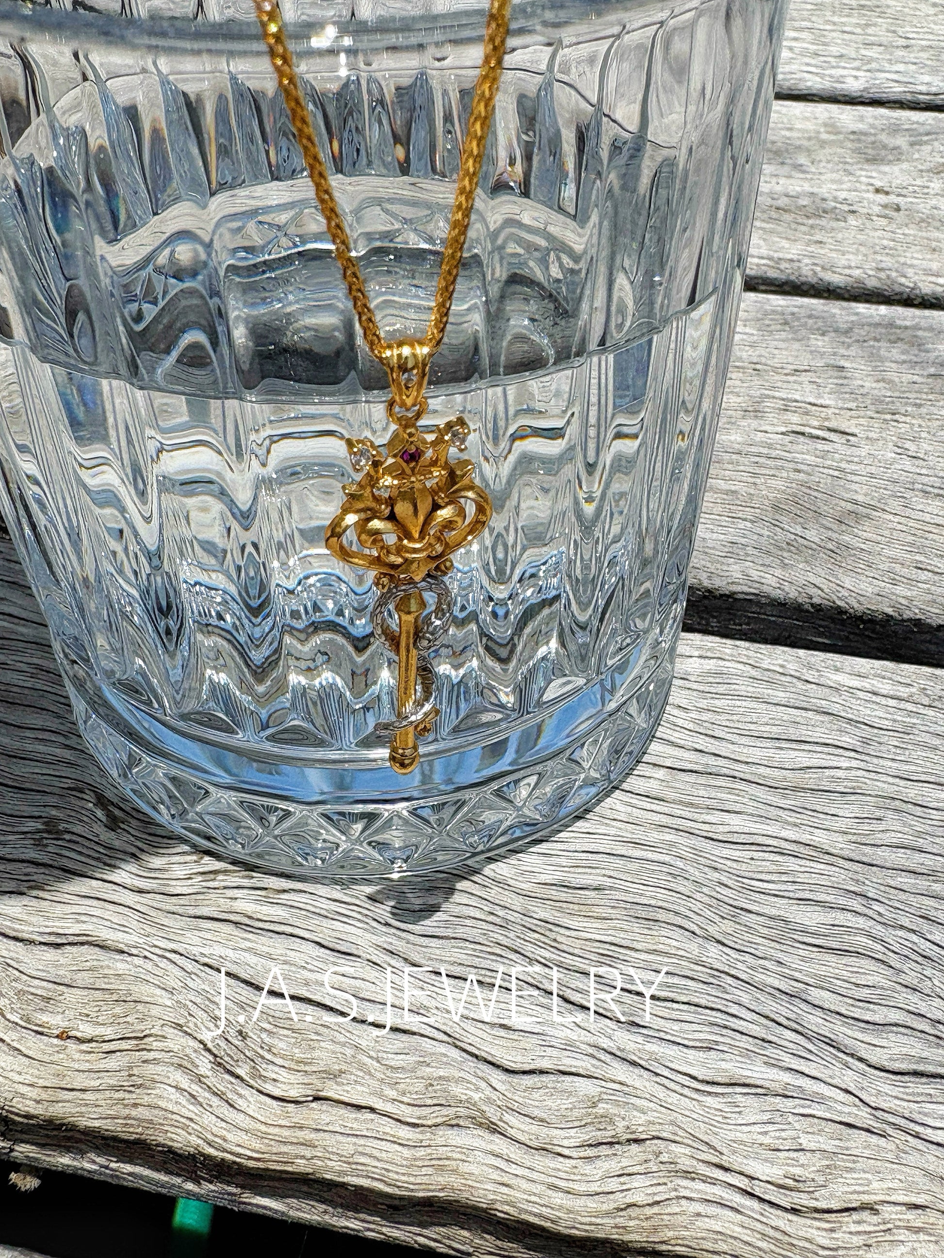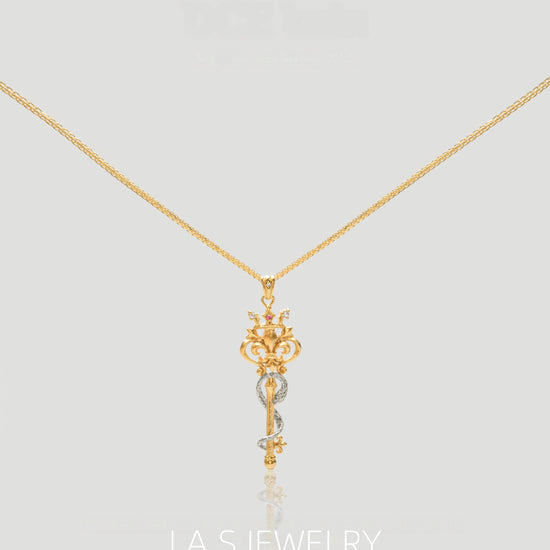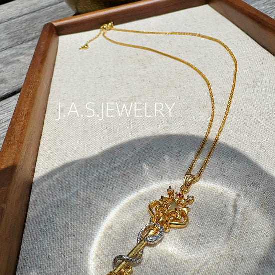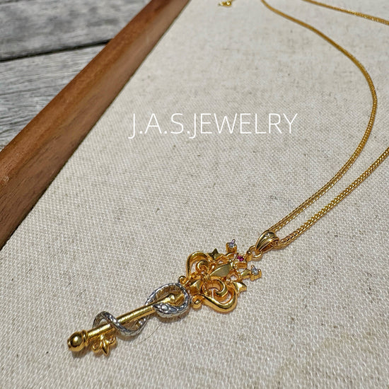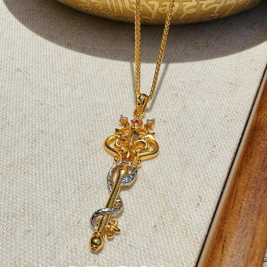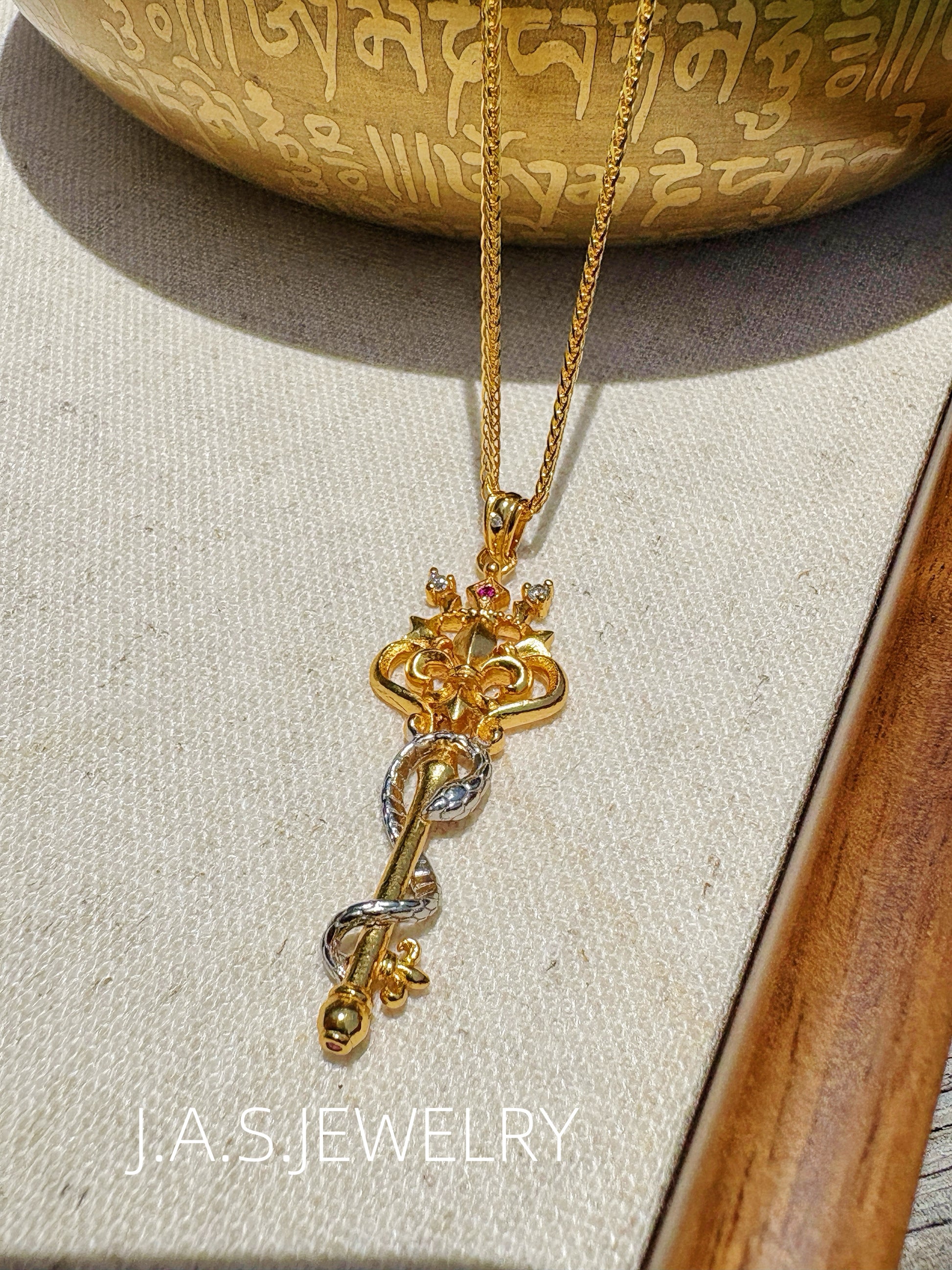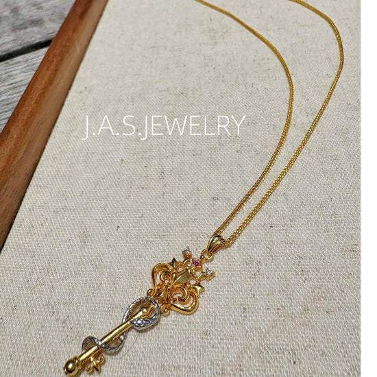 Inspired by the symbolism of protection and transformation, this necklace features a refined key motif entwined with a serpent. The key represents wisdom and new beginnings, while the snake symbolizes strength and rebirth. Finished in a two-tone gold and silver design with subtle zircon accents, it balances vintage elegance with modern detail.