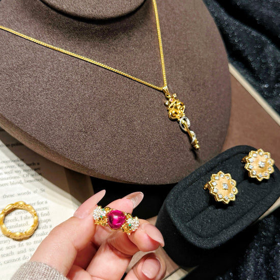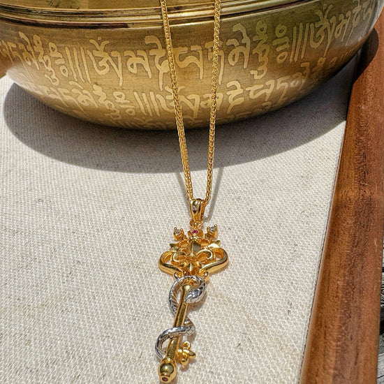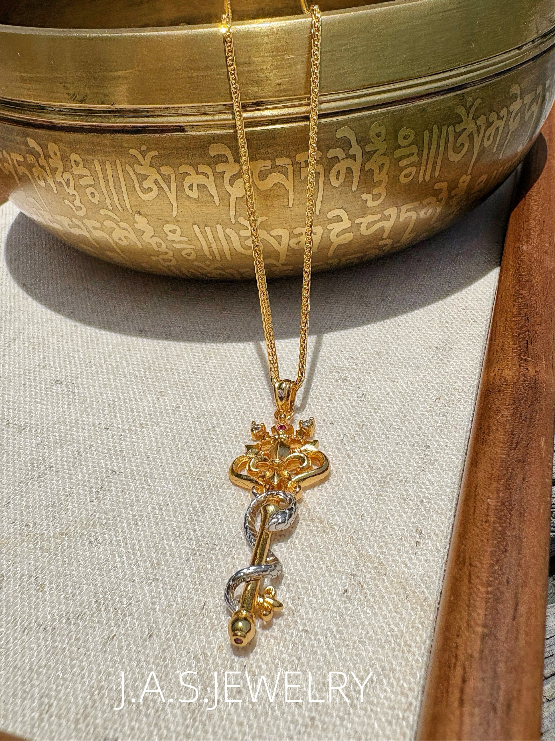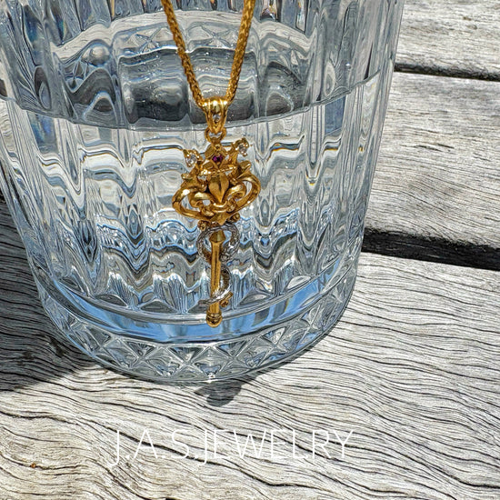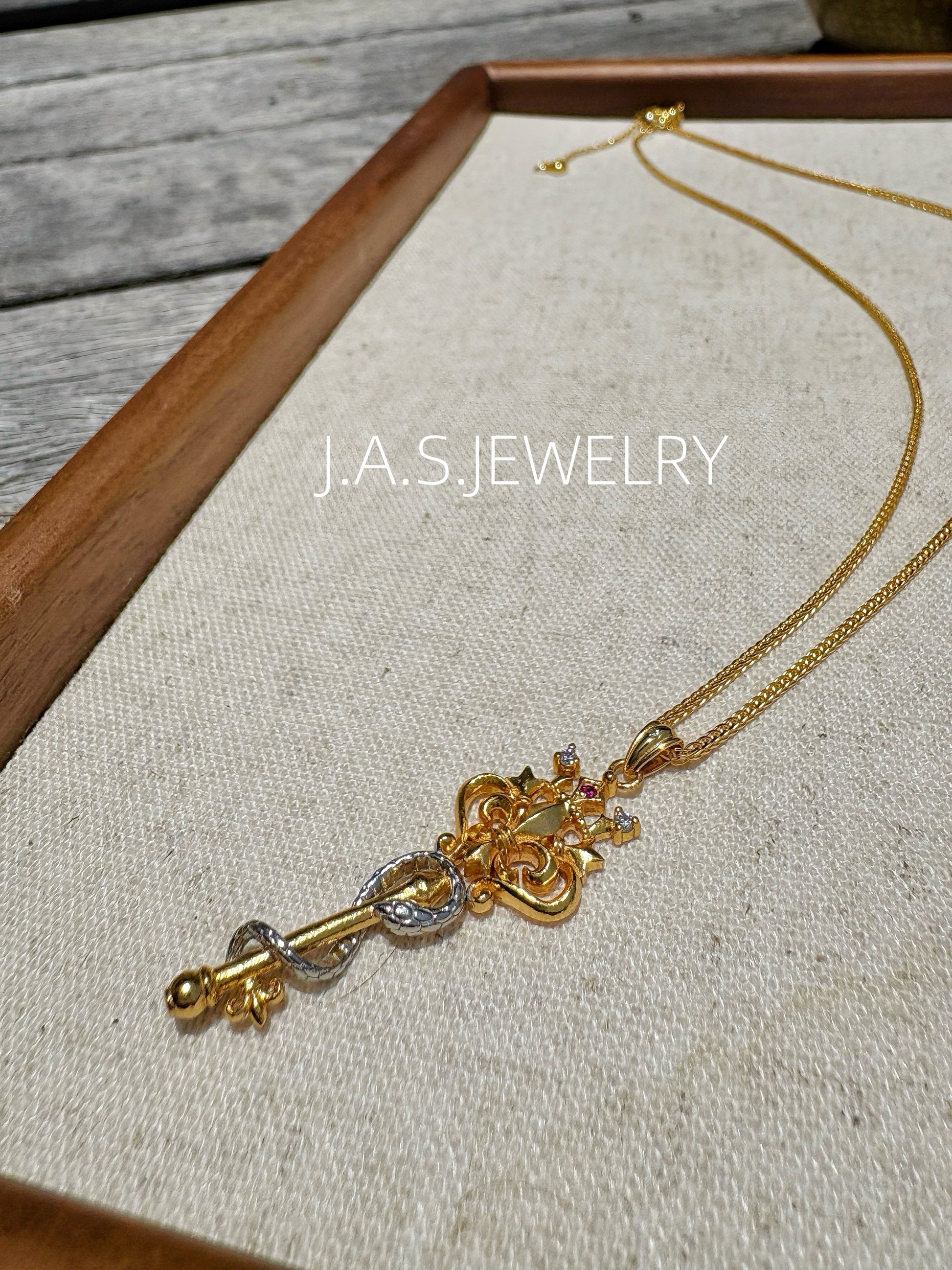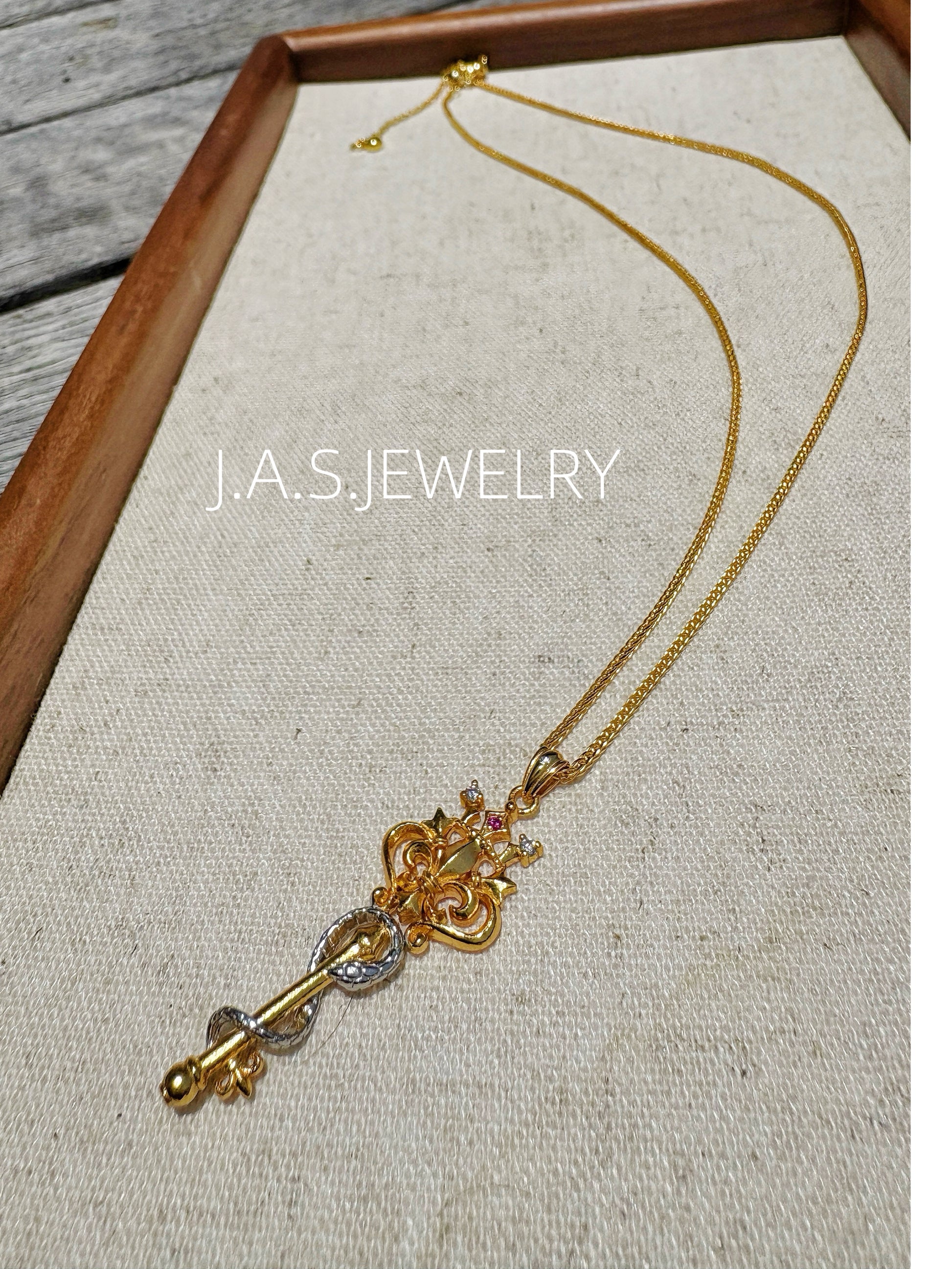 Inspired by the symbolism of protection and transformation, this necklace features a refined key motif entwined with a serpent. The key represents wisdom and new beginnings, while the snake symbolizes strength and rebirth. Finished in a two-tone gold and silver design with subtle zircon accents, it balances vintage elegance with modern detail.