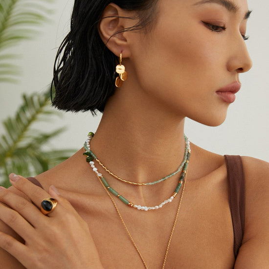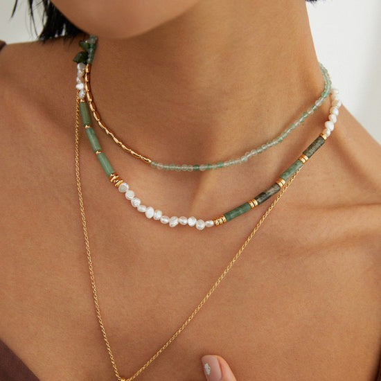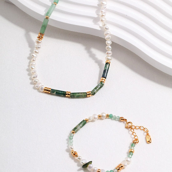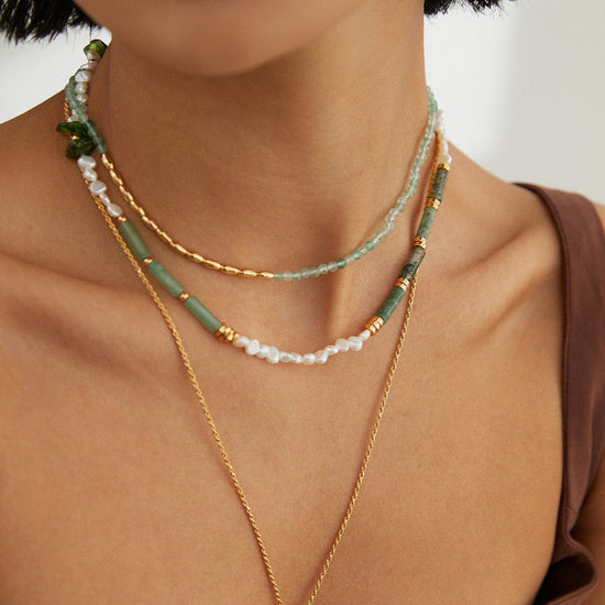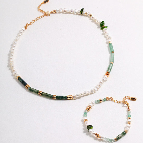 This necklace combines green-toned jade and natural pearls, creating a stylish and unique design. The blend of materials gives it a fashionable, Instagram-worthy look that stands out effortlessly. Perfect for those who love modern and chic jewelry.