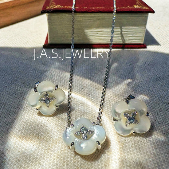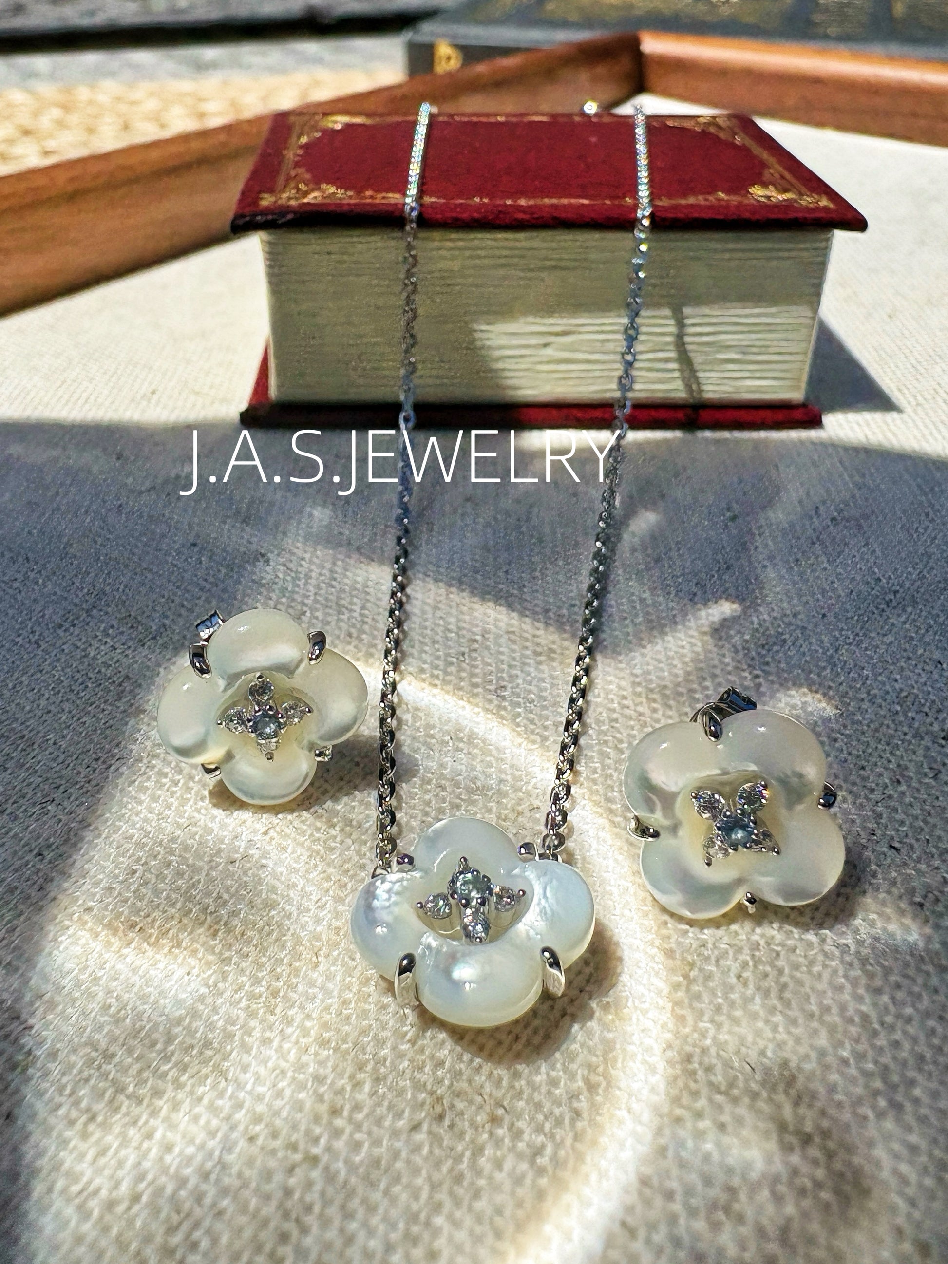 Inspired by the serene beauty of seashells, this set features natural white mother-of-pearl with a soft, iridescent sheen.